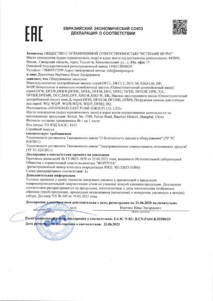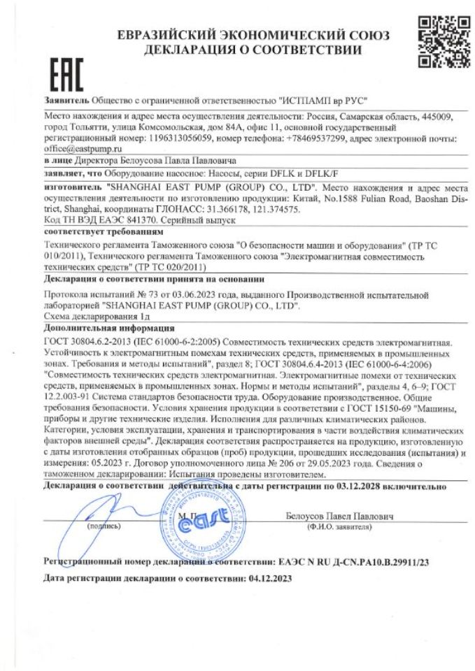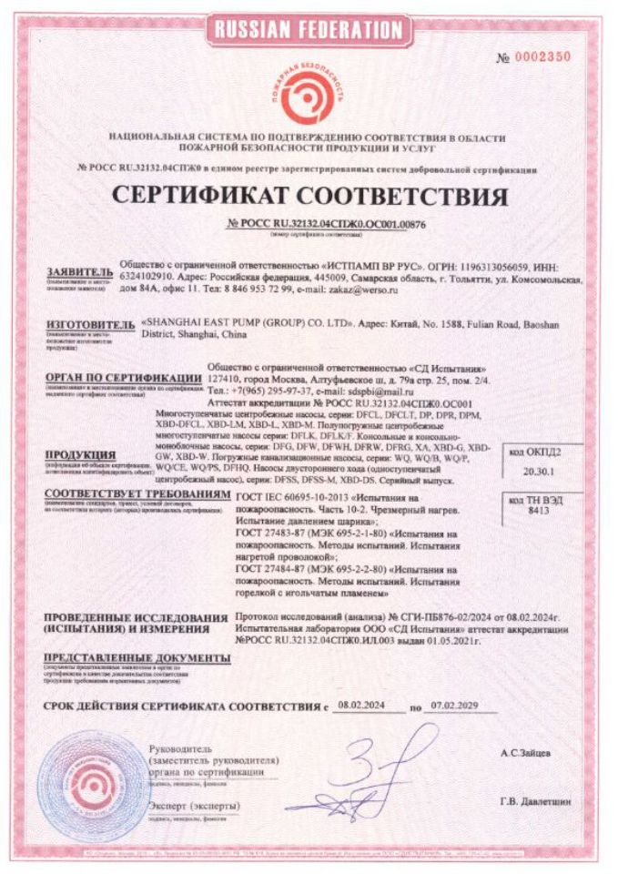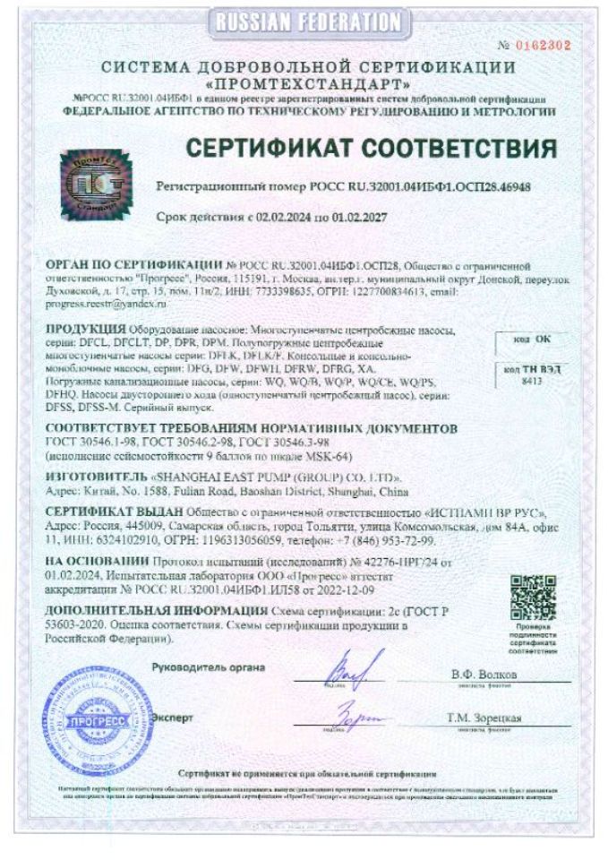 Насосы имеют необходимые сертификаты и разрешены к использованию в России.